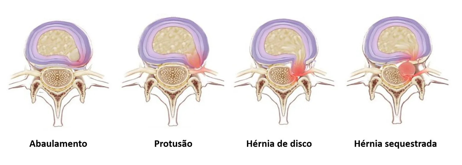 O disco intervertebral é uma estrutura localizada entre uma vértebra (osso) e outra da coluna; o disco funciona como um “amortecedor” entre as vértebras. Quando parte do disco sai da sua localização normal, acontece a hérnia. Existem diferentes tipos de alteração dos discos interverebrais – abaulamento, protrusão, extrusão, extrusão migrada, fragmento discal sequestrado – como pode-se ver na figura abaixo.
